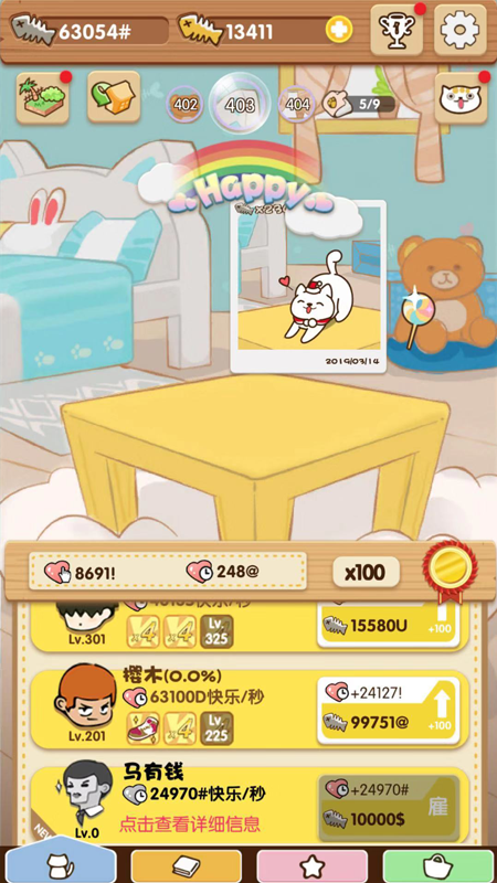 在战斗玩法中,玩家需要通过点击方式增加猫咪的快乐值,当快乐值达到满格后就可获得胜利。猫咪在不断突破关卡的过程中,还会得到银鱼骨等奖励道具,用于招募和升级人物,解锁毛绒球、无影手等技能。