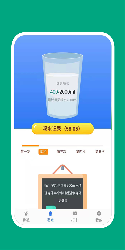 4)提醒喝水:软件定期提醒用户喝水,帮助用户保持良好的水分摄入,更好地进行运动。