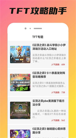 TFT攻略助手安卓版推送给你们更好地热门游戏的攻略指南,快速掌握游戏的技巧和策略,而且还有各种分类专题游戏信息、技巧和秘籍,各种分类的游戏信息,让众多游戏爱好者们天天都能获取新玩法内容。