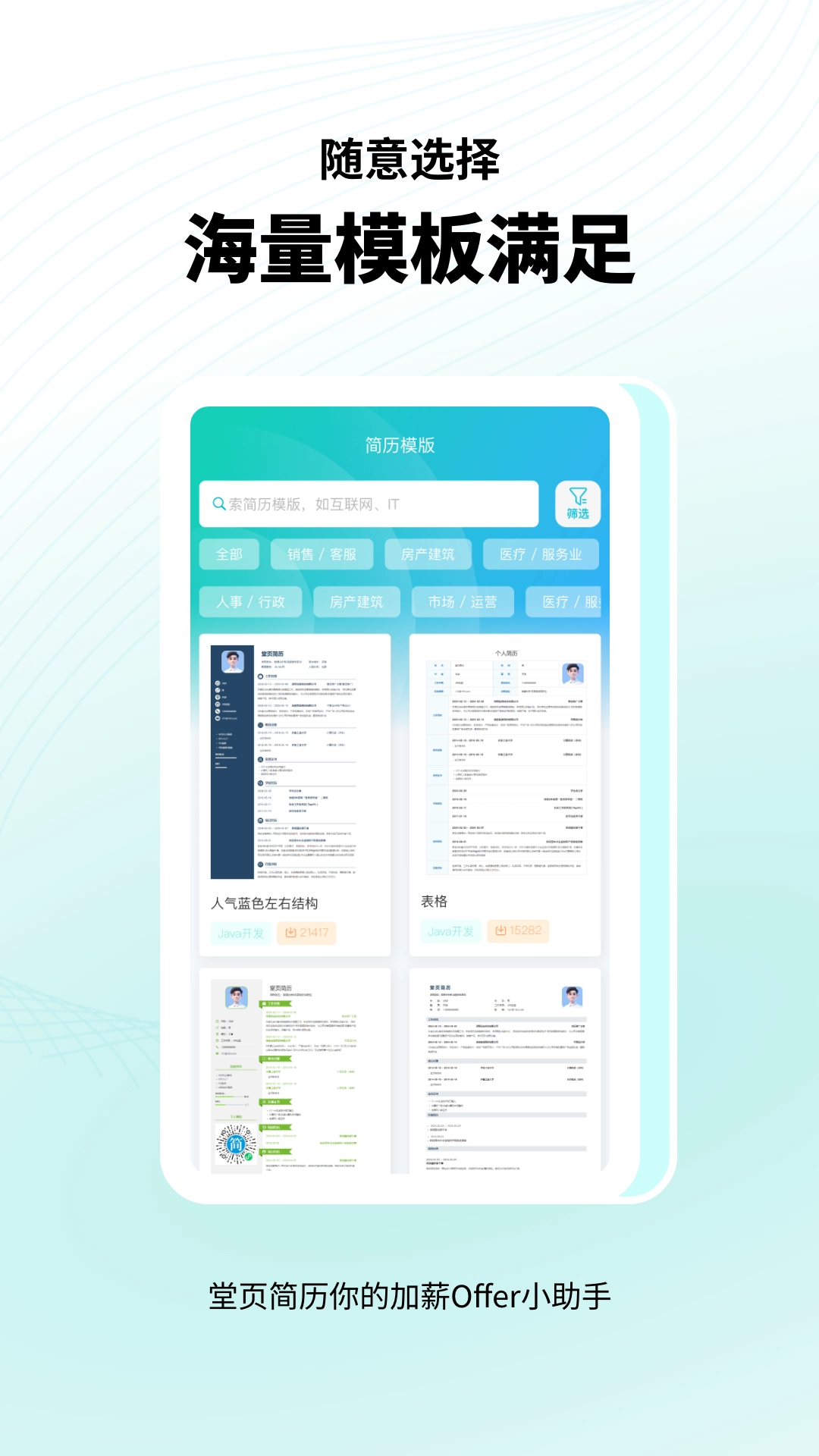 海量简历模板:涵盖不同行业(IT、金融、教育、设计等)和求职场景(应届生、职场人士、自由职业者)。