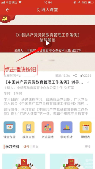 4、点击“播放”按钮观看主辅导视频。完整看完才有学时哦!!!