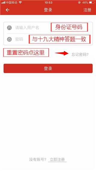 小贴士:登录账号为党员身份证号码,如果忘记登录密码需要重新设置密码,可以点击“忘记密码?”按钮,按照提示重置密码。