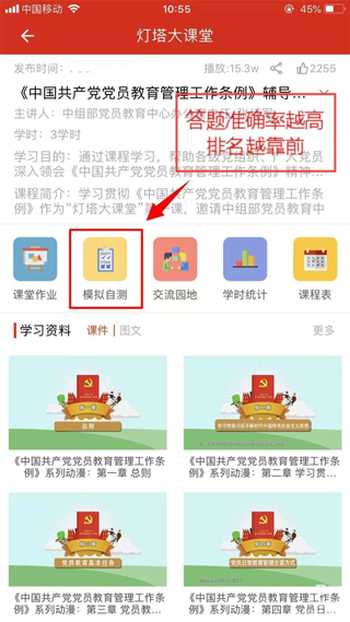 5、学完辅导视频快来点击模拟自测检验下学习效果吧。答题没有时间限制,拿不准的题目可以找找学习材料再回答,答题准确率越高排名越靠前。