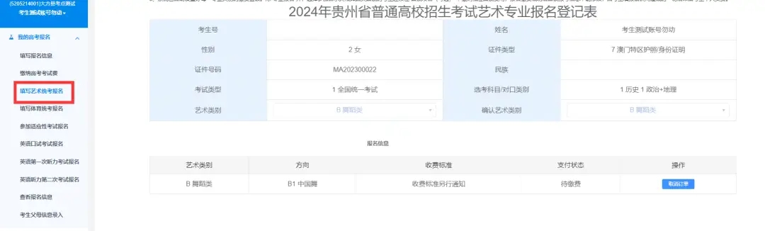 访问考生web端【我的高考报名】-【填写艺术统考报名】,在规定时间内填写报考信息后点击报名缴费扫码缴费。如下图所示: