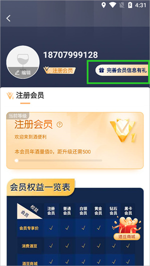 1、加入会员的方式可以打开并登录洒便利app后,直接进入【我的】页面中点击页面上方的【注册会员】(下图绿色方框处)
