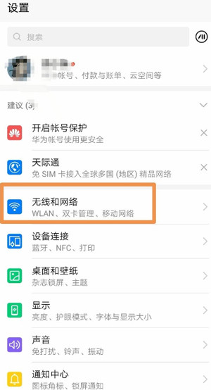 1、打开手机主菜单,选择“设置”,然后选择“无线和网络”;