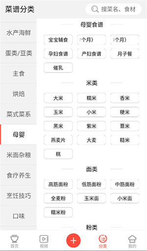 2、分类功能就很贴心了,对于不同的群体有不同的分类,各种养生、食疗、母婴菜品等都为用户分好了类,什么菜不能吃,什么能吃都在分类中能知道
