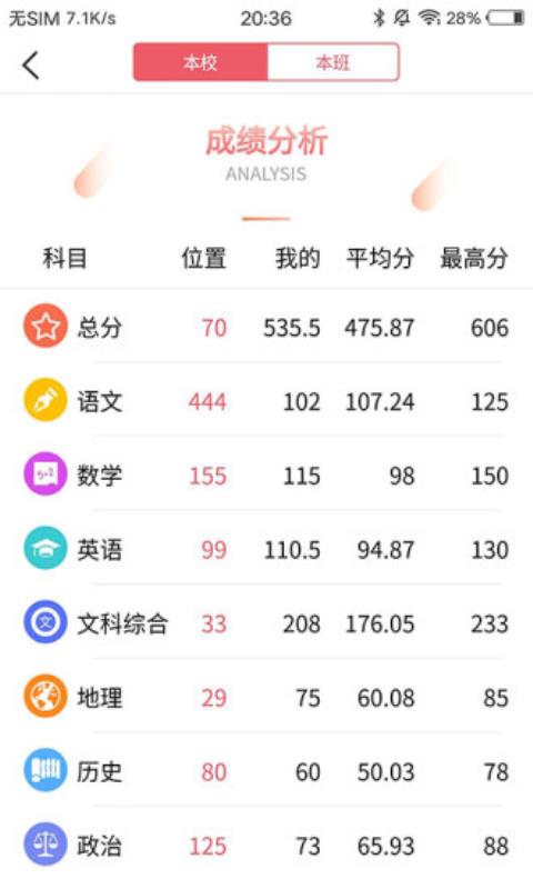 3、智能的成绩分析,可以精确的分析每个科目的排名;