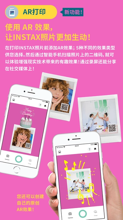 想要体验增强现实技术带来的有趣效果吗?在打印 instax 照片前添加 ar 效果,随后用智能手机扫描照片上的二维码即可!
