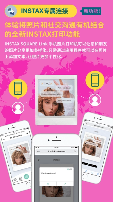 instax square link手机照片打印机,能让你与朋友之间的照片分享形式更为丰富多元。仅需借助应用程序,就能在照片上增添文本,赋予照片更多个性色彩!