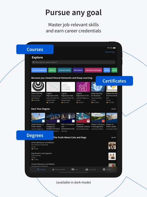 Coursera在线课程平台是一款能在手机上实现线上授课的软件。平台汇聚了国内外各专业的优秀教师进行教学,学生可依据自身时间与节奏学习,随时观看老师上课的录音录屏进行学习。课程的学习进度与数据会自动统计,使用起来极为便捷。有需要的小伙伴快来使用吧!
