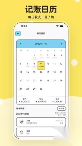 6、日历视图:当用户进入日历页面,便可以依据日历所提供的信息,查找每日的账单详情。