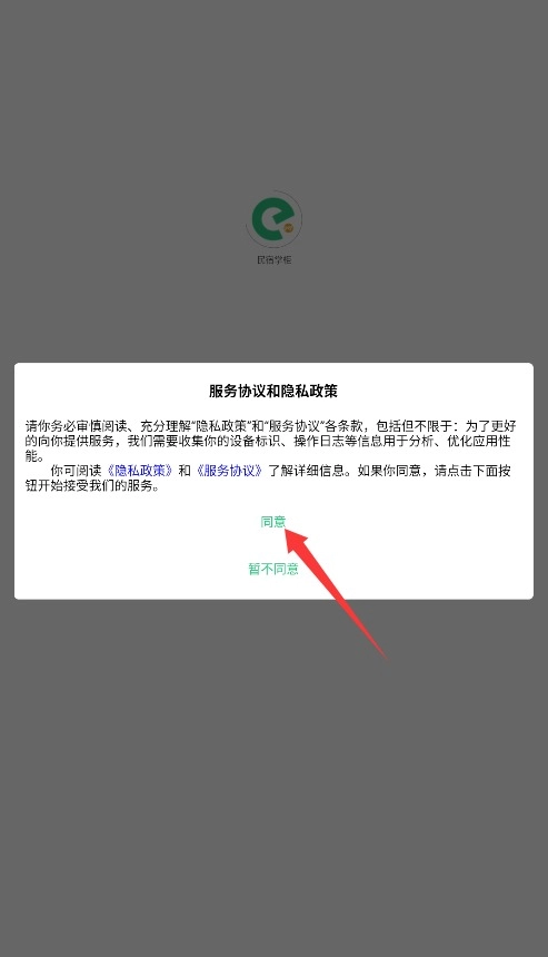 1、初次使用需完整阅读平台服务条款与隐私政策,确认后点击同意并使用进入应用。