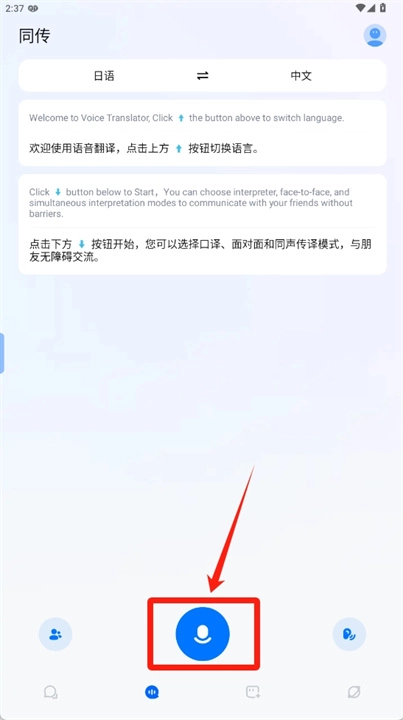 4、轻点麦克风按钮,便能在口译、面对面以及同声传译模式中进行选择,从而与朋友实现无障碍沟通。