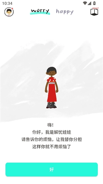 1. 小时候,外婆送了我一个娃娃,叫解忧娃娃。她告诉我,要是把烦恼倾诉给它,它就会替我承担烦恼。在这个App里也一样,只要向解忧娃娃诉说你的烦恼,它便会帮你分担。
