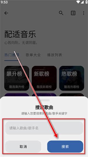 2. 在搜索框内输入歌曲名称或者歌手名称,接着点击“搜索”按钮来查找音乐。