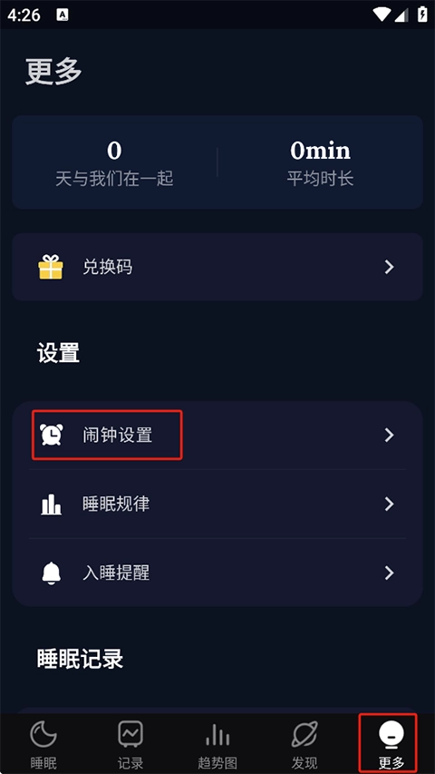 2. 开启睡眠监控应用程序,点击“更多”,进入“闹钟设置”。