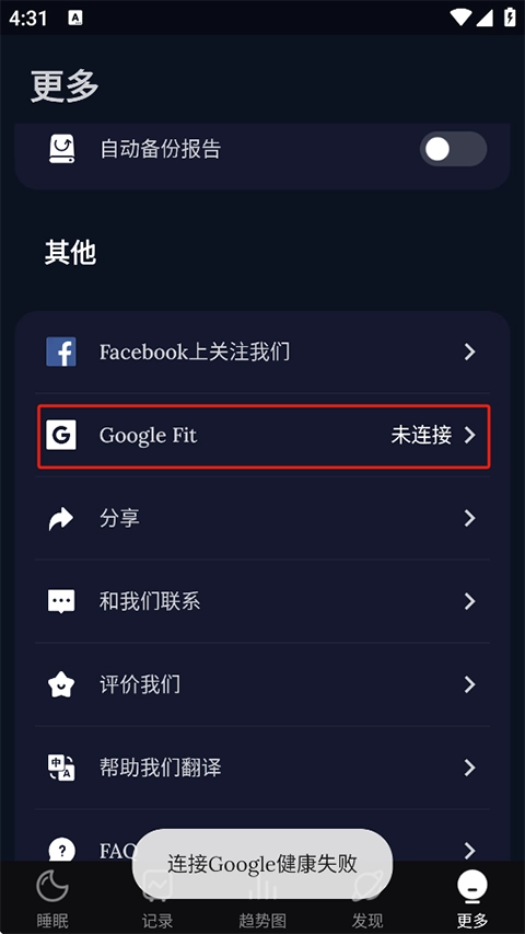 1、更多标签页 > Google Fit > 连接。
