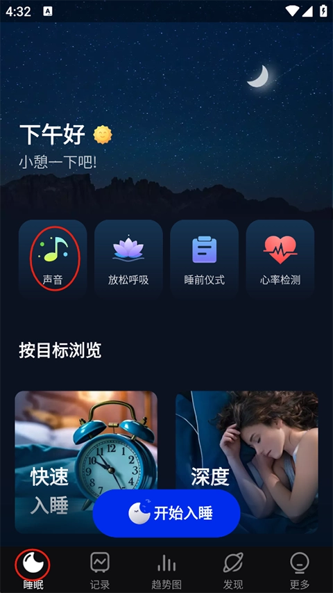 睡眠选项卡 > 单击顶部的声音图标;