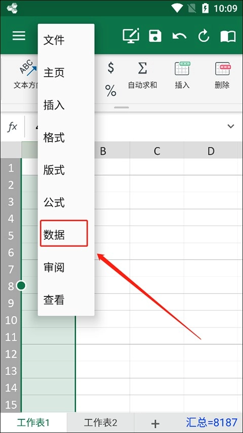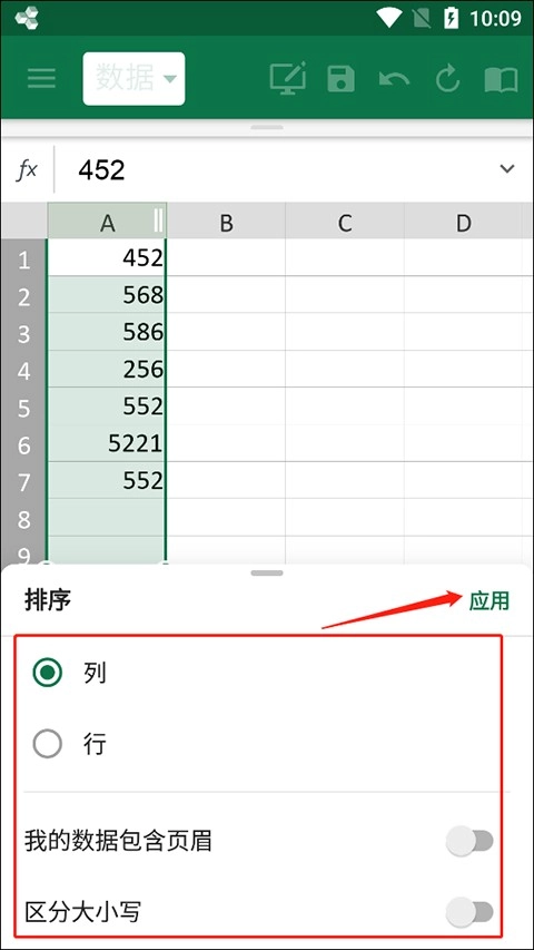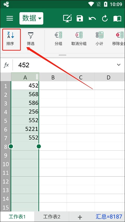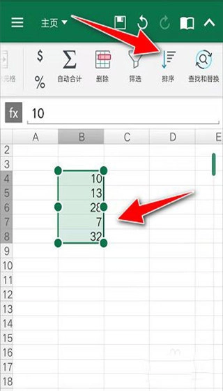 5、在单元格添加一列数字并选中,再点击界面上的"排序"菜单。