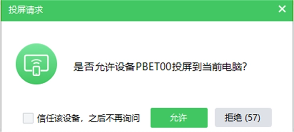 当在手机上启动投屏操作后,电脑屏幕会弹出一个投屏请求窗口,显示“是否允许设备xxx投屏到当前电脑?”。此时,请点击“允许”以接受请求。若出现该提示时,您不想每次投屏都看到此请求,那么可以勾选“信任该设备,之后不再询问”选项。