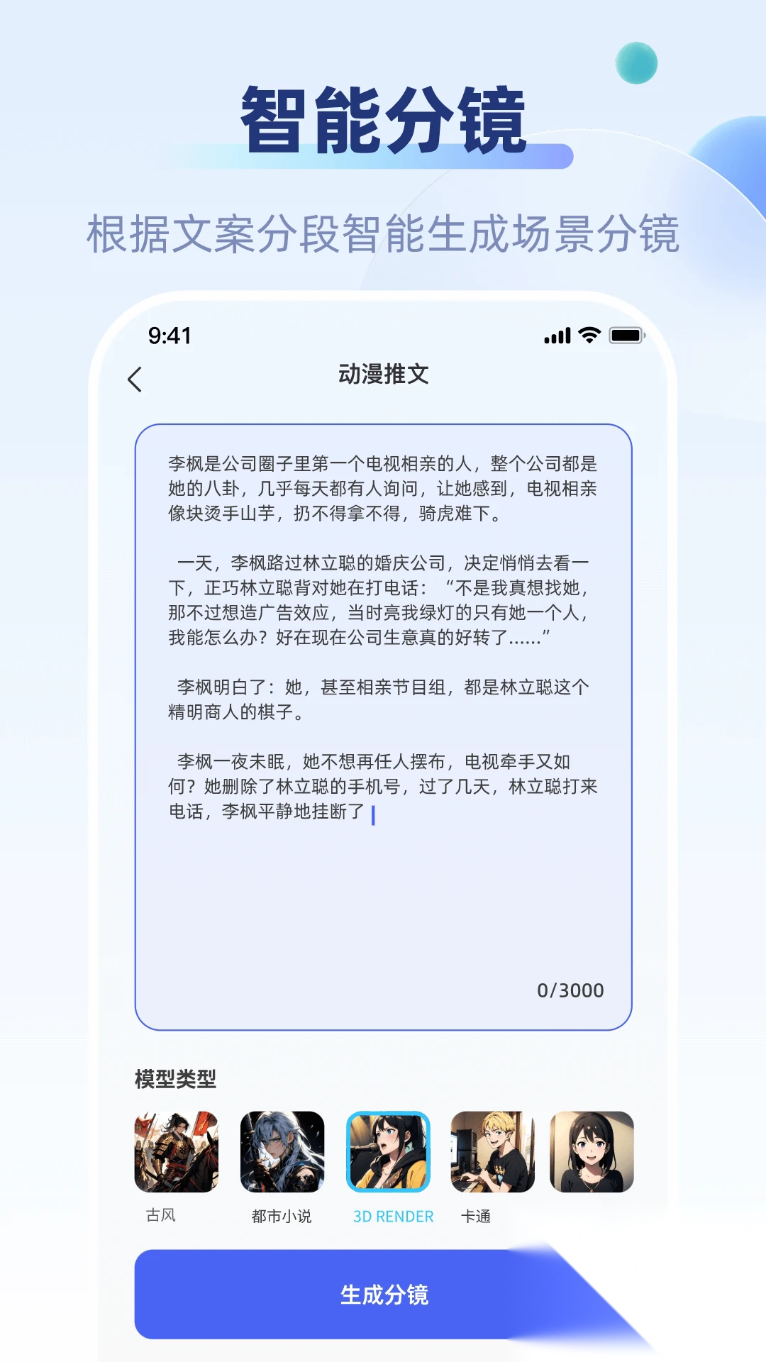 5、也可以输入各种动漫文案内容一键生成各种场景的分镜内容;