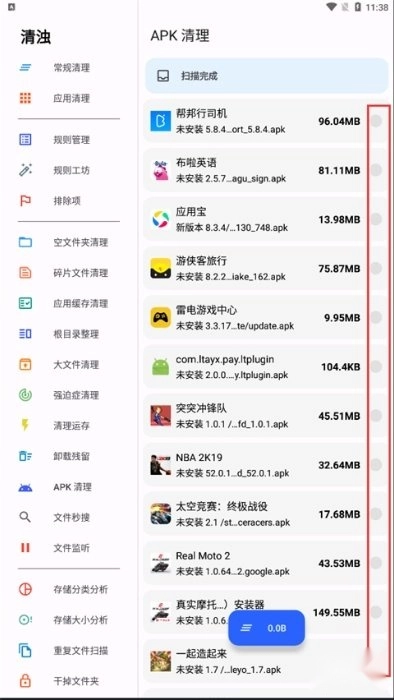 5、扫描出你手机中的所有apk,若要删除,只需点击你想要删除的软件或游戏即可。