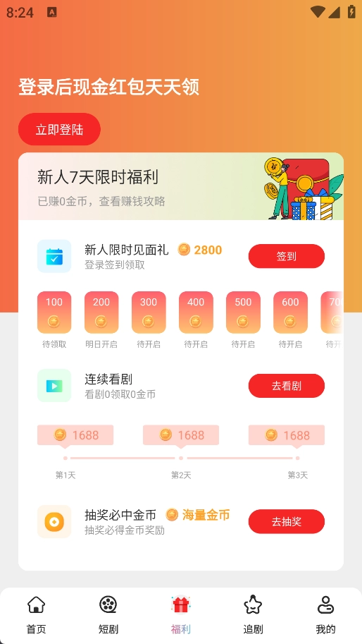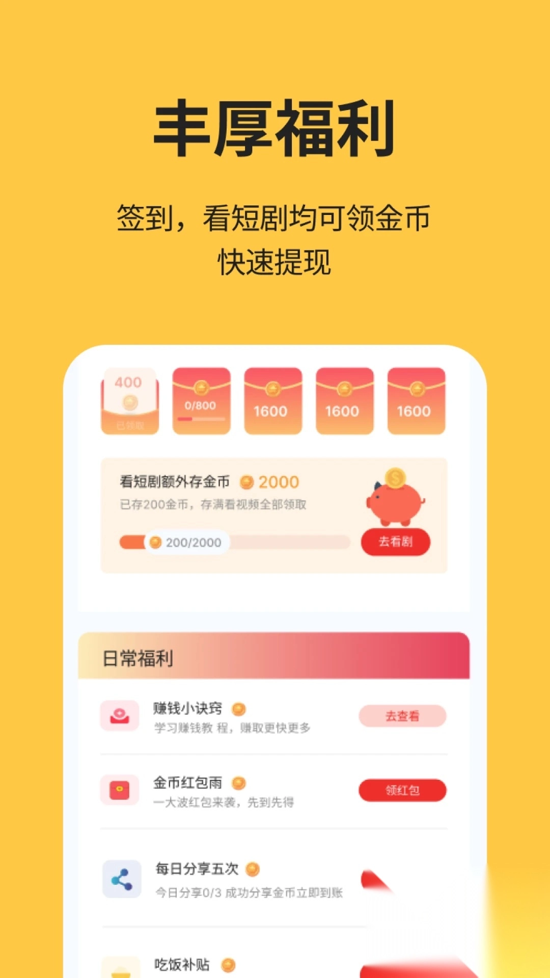 2. 每天签到并观看短剧即可赚取金币,提现快速到账,收益清晰可见。