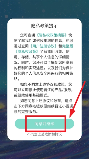 先安装小树苗文学,安装完成后打开该应用。打开时,会出现隐私政策提示,需同意此提示后再继续操作。