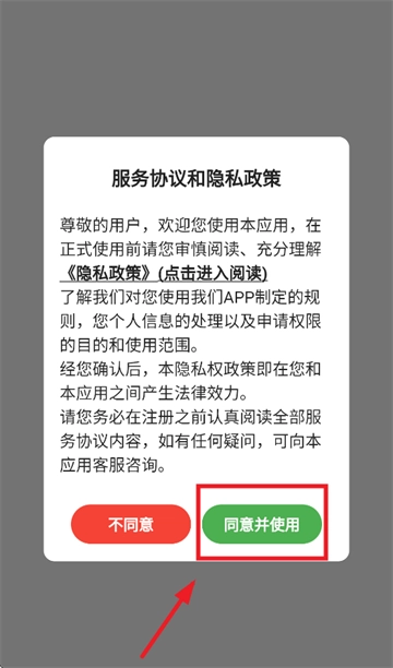 下载并开启当当来骑手端,当出现服务协议与隐私政策提示页面时,点击同意并使用。