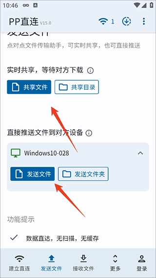 在手机上,选中文件或文字后,点击分享功能,分享至“pp直连”。