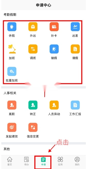 2.根据申请事项,点击相应图标→发起申请→填写内容→提交