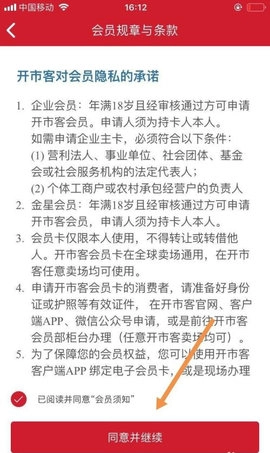 4、仔细阅读会员规章与条款,然后点击“同意并继续”。