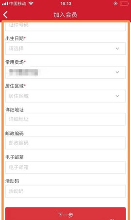 6、请填写您的相关信息,其中涵盖姓名、证件类型以及常用卖场等内容,完成后点击“下一步”。