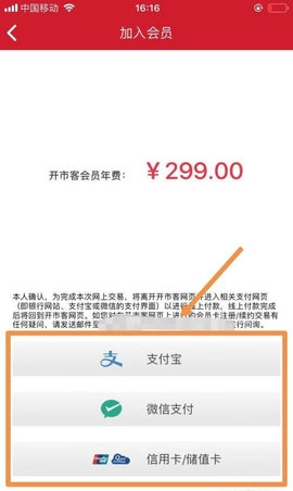 8、接着挑选交易方式并完成支付就可以了,开市客会员的年费是299元。