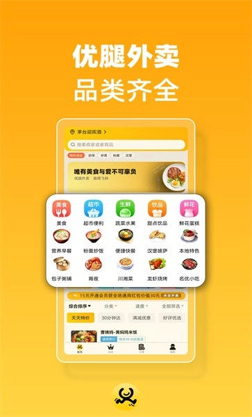 1、优腿外卖手机版,作为高品质生活服务平台,专注于学校、市区、城市及生活圈,为你打造完美生活助手!