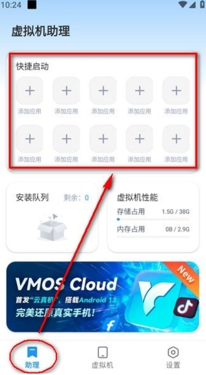 4、若要导入应用,可点击左下角的“助理”,接着在“快捷启动”中选择“添加应用”来完成导入操作。