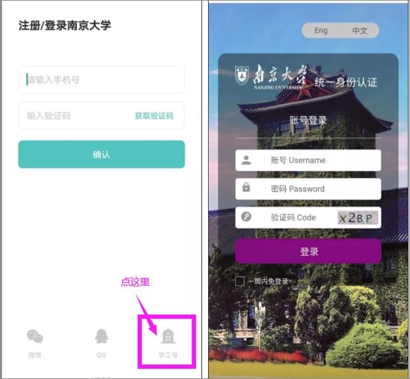 安装完成后,登录界面如下所示。首次使用时,请点击右下角的“学工号”,通过统一身份认证进行登录,并绑定手机号。绑定完成后,再次使用该应用,既可以选择使用手机号登录,也能选择通过统一身份认证登录。