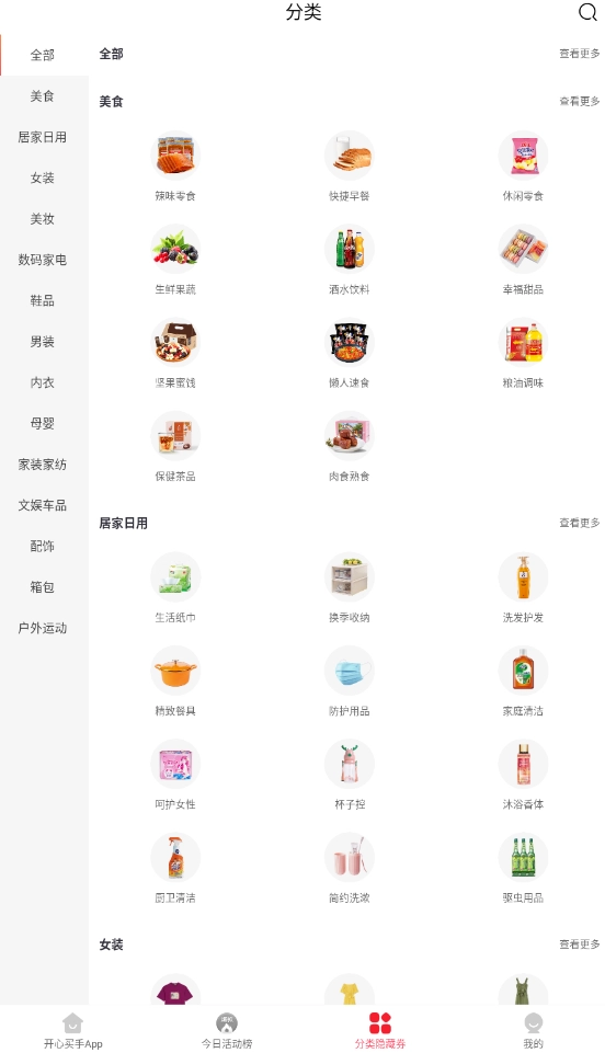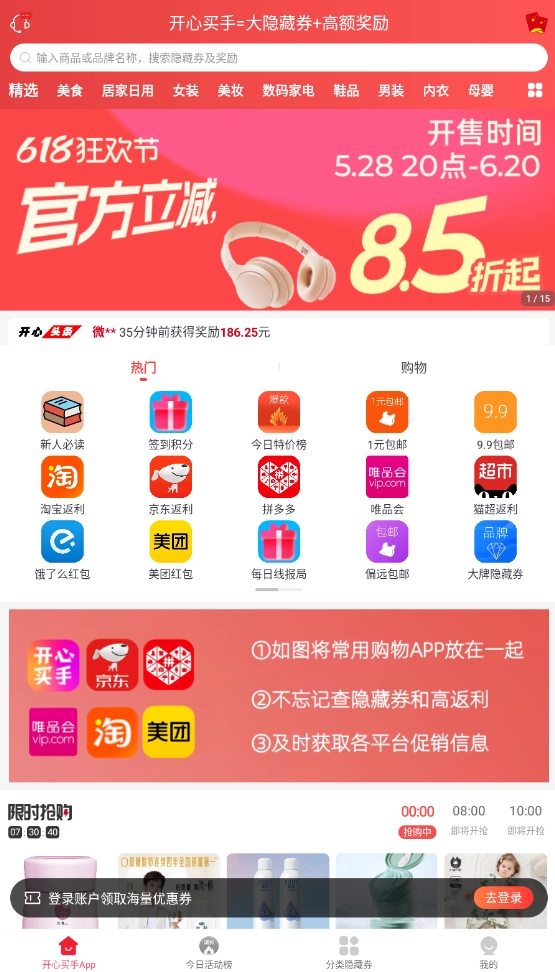 1、启动开心买手后,首页聚合展示淘宝、京东等主流电商平台的优惠商品信息。