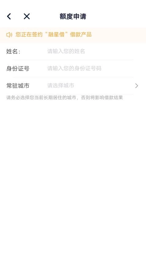1、启动融星借后,点击首页"申请额度"按钮进入资料填写页面。
