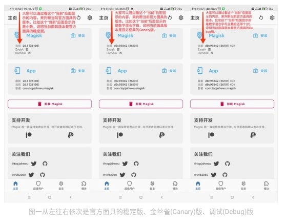 有些新手记性不太好,在设置里把“隐藏Magisk应用”改了面具的名称,结果第二天就忘记自己用的面具是什么版本了。实际上,这种情况还挺常见的,所以单纯依靠“图标是脸谱、应用名称为Magisk”这种判断方式,存在一定的局限性。接下来,我教大家如何通过面具主页判断面具版本。下面图一展示的面具主页都是关于面具的,从左到右依次为稳定版、金丝雀(Canary)版、调试(Debug)版。