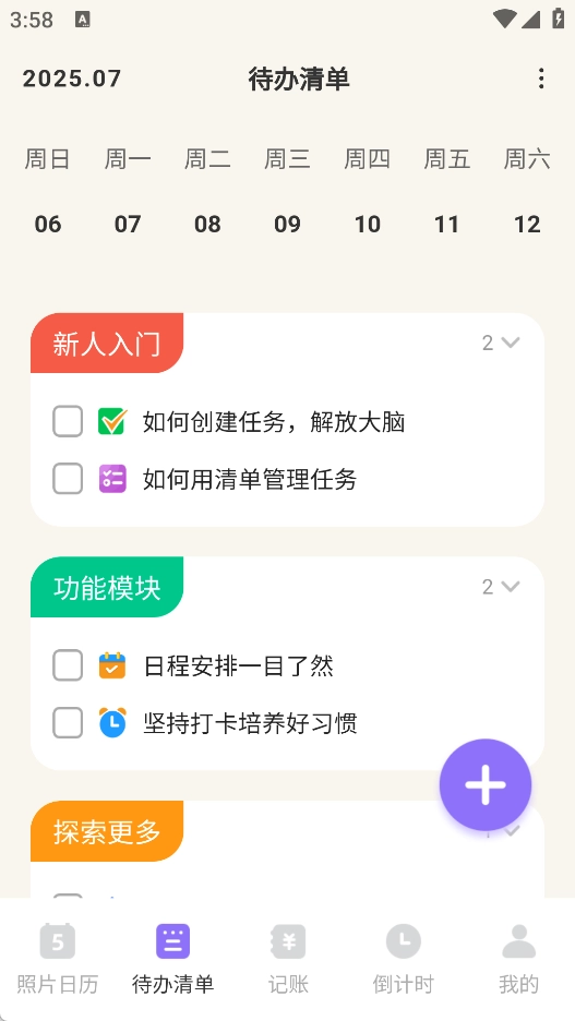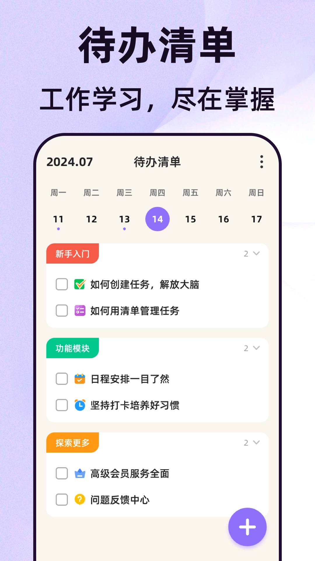 2、于待办清单内,随时点击“+”号,即可添加各类待办事项。此外,还设有新手入门、功能模块以及探索更多等功能。