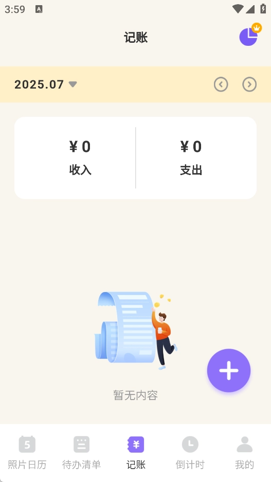 3、于记账页面,可点击“+”号,进而记录详细的收入或支出情况,与此同时知悉最新的账单信息。