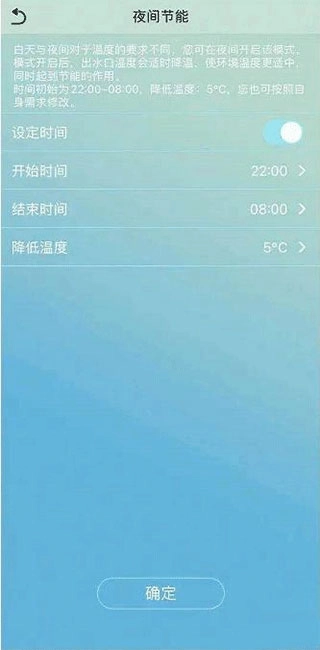 3、大家还能开启夜间模式,在设定的时间范围内,出水温度会自动降低5℃(该降幅可按需调整)。稍低一些的室温,既有助于节能,又更有利于提升睡眠质量。