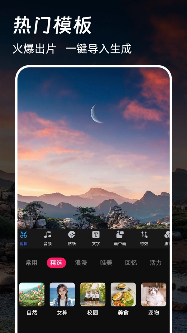 -一键成片:拥有丰富多样的模板,不管是亲子记录、节日纪念、旅行Vlog、风景大片制作、宠物专辑整理,还是潮流卡点视频创作等,通通都能一键剪辑完成。海量模板任你挑选,助你彻底解放双手与大脑!