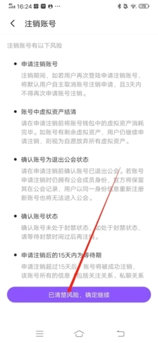 2、确认注销账号的各种事项以及风险后,点击下方“以清楚风险,确定继续”;