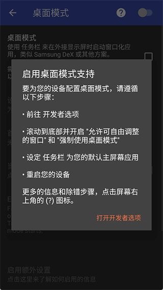 第一步,打开任务栏中的应用程序,接着点击“桌面模式”。随后,仅需勾选复选框,应用程序便会引领您完成设置流程。若想获取更多信息,点击屏幕右上角的(?)图标即可。