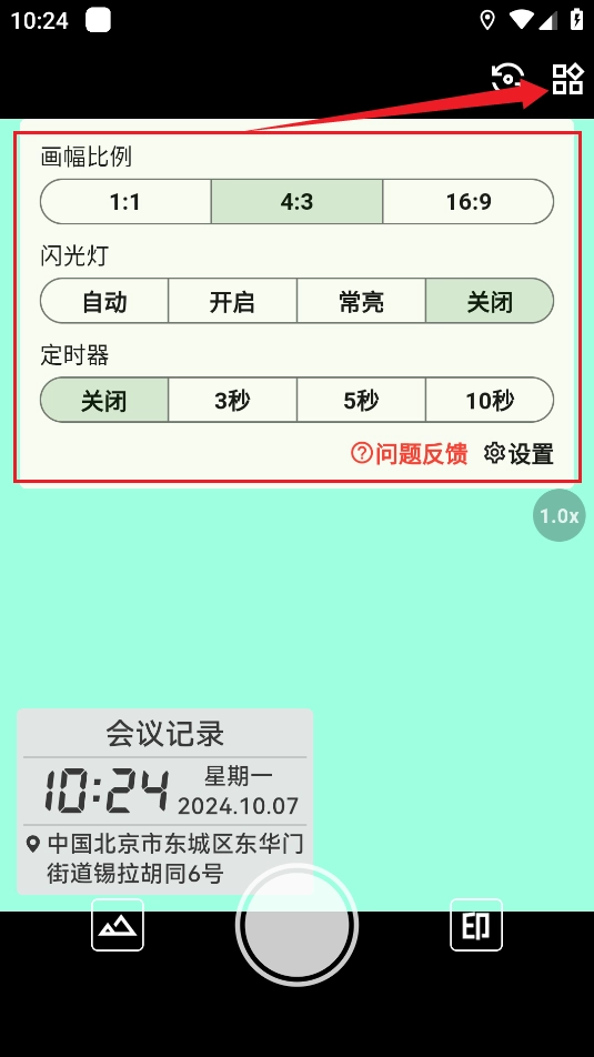 6、点击右上角的按钮可以对相机功能进行设定,诸如画幅比例,是否开启闪光灯,以及定时器功能。