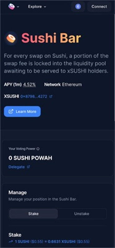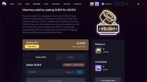 3、寿司吧(Sushi Bar):主要功能为协助用户质押SUSHI代币,其回报率并非固定,通常处于5% - 30%的区间(平均回报率为6.31%),具体数值取决于整个协议中以美元计量的质押资产价值。