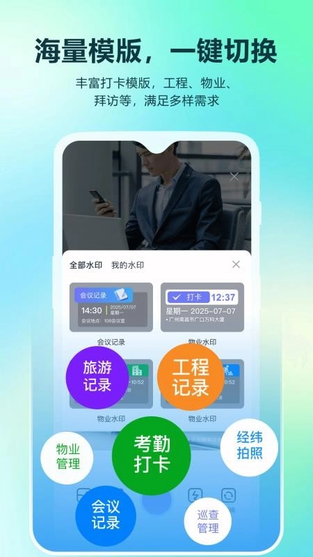 真实时间水印拍照打卡相机,是一款集相机拍照、打卡记录、水印添加功能于一身的应用软件。它包含超高清的水印拍照打卡工具,让水印相机拍照与打卡记录变得格外便捷,能助力工程人员更高效地完成工作打卡与考勤记录。其水印添加领域极为丰富,可轻松满足各行各业添加水印照片的需求,使得大家日后用水印相机记录和打卡更为便利。 不仅如此,真实时间水印拍照打卡相机手机版软件拥有全维度的水印资源,诸如各种时间、地点、天气、经纬度、文本水印、图样水印等类型的模板都能随心使用。对这款程序应用感兴趣的朋友们,千万不要错过,欢迎前来本站体验使用。
